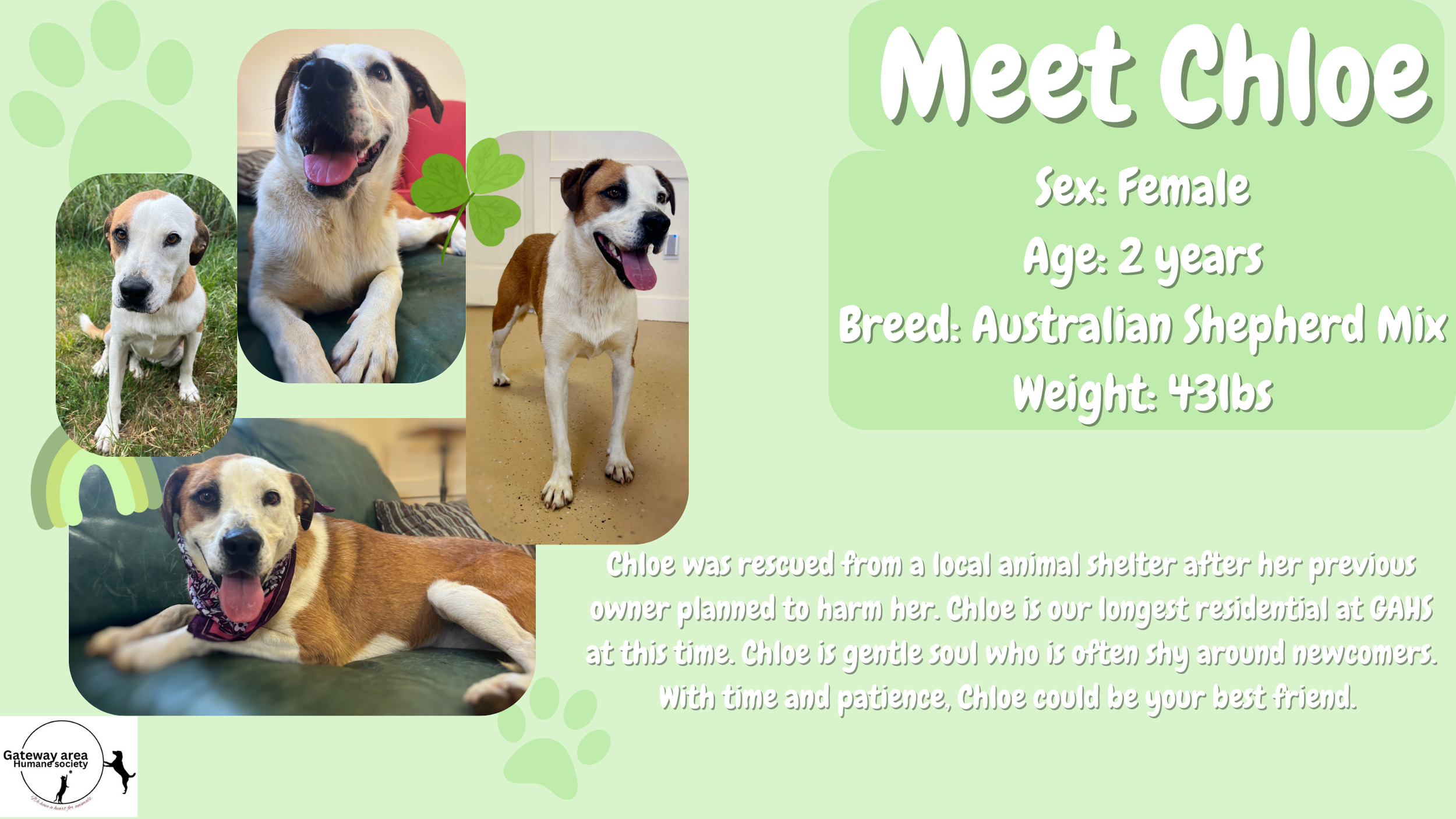 If you’re looking for a resilient, loyal dog who’s just waiting for the right person to believe in her, Chloe is ready to meet you. Help her write the happy ending she so deeply deserves.